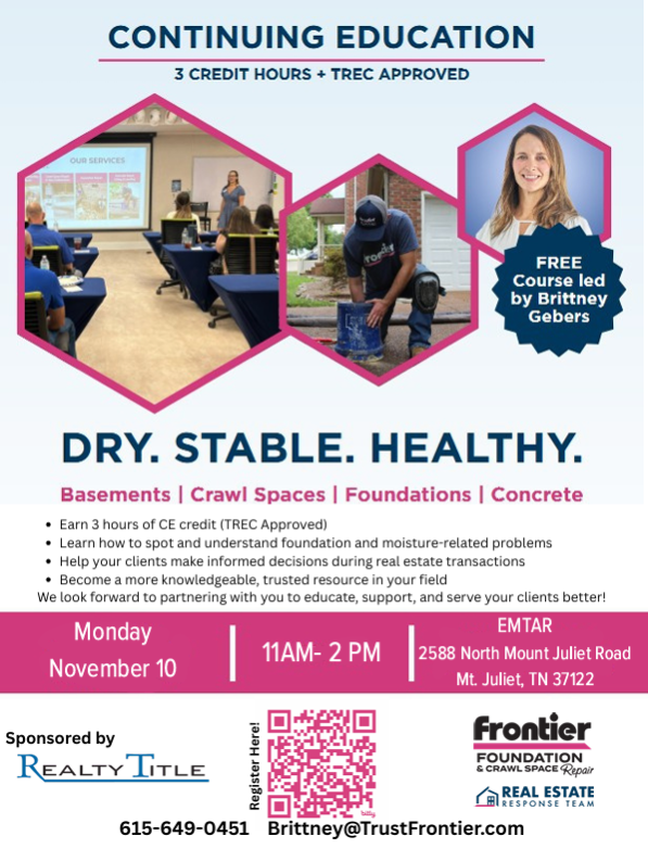 Earn 3 hours of CE credit (TREC Approved) -Learn how to spot and understand foundation and moisture-related problems -Help your clients make informed decisions during real estate transactions -Become a more knowledgeable, trusted resource in your field We look forward to partnering with you to educate, support, and serve your clients better!
